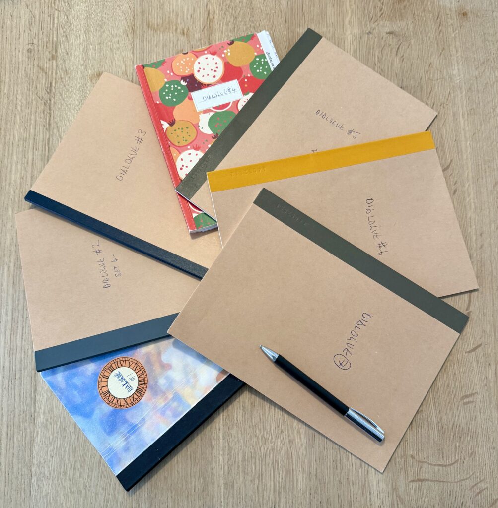 My path to learning dialogue has been long—and is ongoing. The seven notebooks in the image are my reflections since I signed up for the six-month Professional Dialogue Practitioners diploma with Peter and Jane in early 2024.