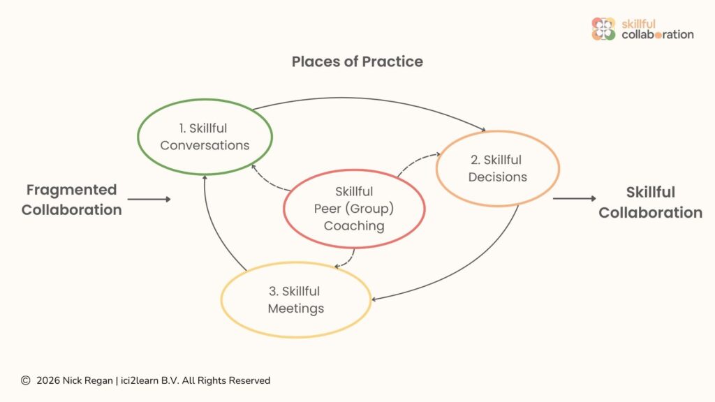 Skillful meetings are the third place of practice for skillful collaboration. Imagine meetings where the most important decisions are made, where people understand the intention and their expected contribution for each agenda item, where skilled facilitation ensures a balanced share of voice, and where team members leave more energized than when they arrived.