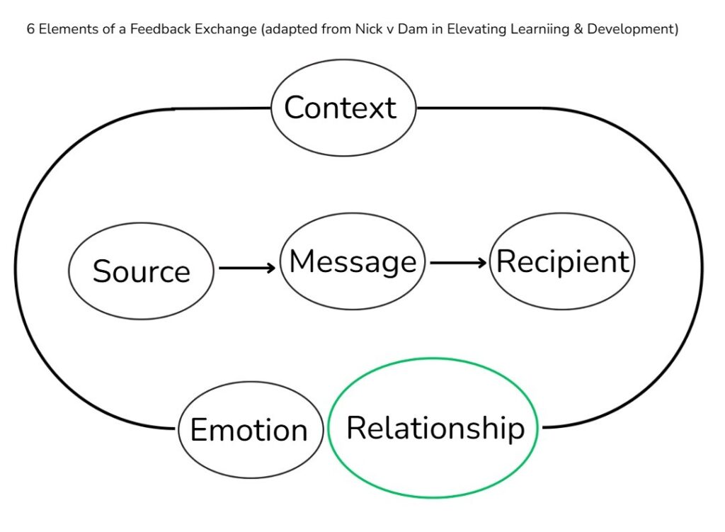 Years later I came across the 5 Elements of a Feedback Exchange in Nick van Dam’s book Elevating Learning and Development. He adapted the model from Gregory & Levy (Using Feedback in Organizational Consulting). Their original framework included four elements — Context, Source, Message, and Recipient. Nick’s adaptation added Emotion, which I find essential. Too often we skip or ignore the emotional side of feedback.